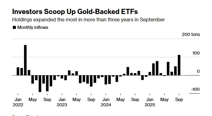 Рынок мгновенно отреагировал. Потоки в ETF, обеспеченные золотом, в сентябре стали крупнейшими за три года, отражая новый виток доверия к драгоценному металлу.