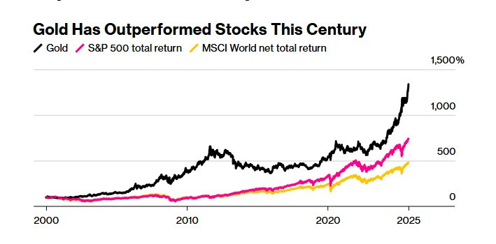 Этот взлет стал кульминацией стремительного роста последних лет: только в 2025 году золото подорожало более чем на 50% после уже впечатляющего роста на 27% в 2024-м. Всего два года назад унция торговалась ниже $2000, а теперь золото демонстрирует доходность, обгоняющую фондовый рынок за все столетие.