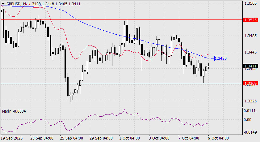 На четырёхчасовом графике цену в качестве первого сопротивления также ждёт линия Крузенштерна (1.3430). Осциллятор Марлин, к сожалению «быков», задерживается на отрицательной территории и пока не может в полной мере подключиться к этому плану роста.