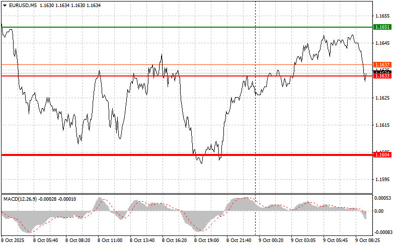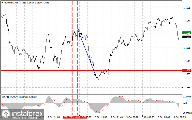 Тест цены 1.1636 пришелся на момент, когда индикатор MACD много прошел вверх от нулевой отметки, что ограничивало восходящий потенциал пары. По этой причине я не покупал евро. Второй тест 1.1635 пришелся на момент нахождения MACD в области перекупленности, что позволило реализоваться сценарию №2 на продажу и вылилось в падение пары на 30 пунктов.