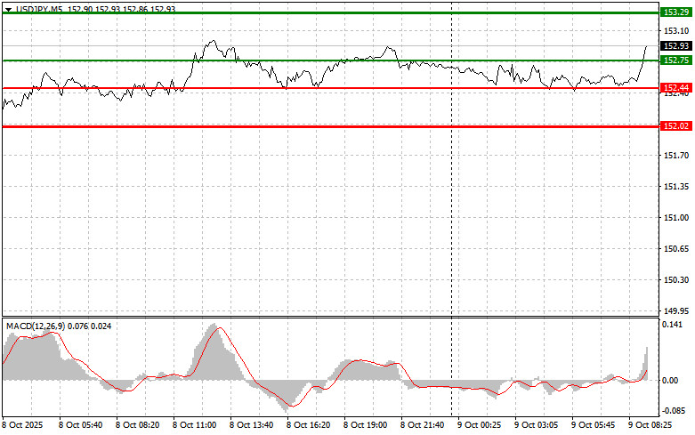 Сценарий №2: продавать USD/JPY сегодня также планирую в случае двух подряд тестов цены 152.75, в момент, когда индикатор MACD будет находиться в области перекупленности. Это ограничит восходящий потенциал пары и приведет к обратному развороту рынка вниз. Можно ожидать снижения к противоположным уровням 152.44 и 152.02.