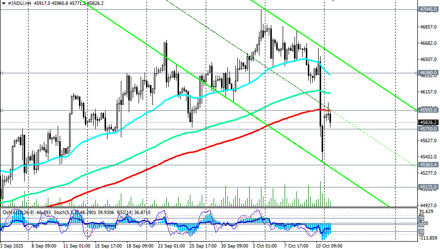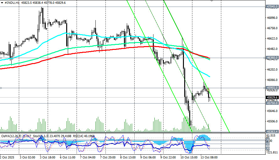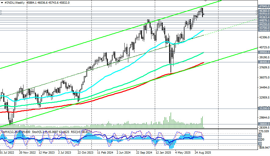 В альтернативном сценарии и после пробоя сегодняшнего минимума 45750.0, а затем важного уровня поддержки 45600.0 (ЕМА50 на дневном графике) снижение цены продолжится в сторону нижней границы восходящего канала на дневном графике и отметки 45360.0. Более глубокая коррекция подразумевает снижение цены к зоне ключевых среднесрочных поддержек и уровней 44250.0 (ЕМА144 на дневном графике), 43700.0 (ЕМА200 на дневном графике), удерживающих индекс DJIA в зоне среднесрочного бычьего рынка.
