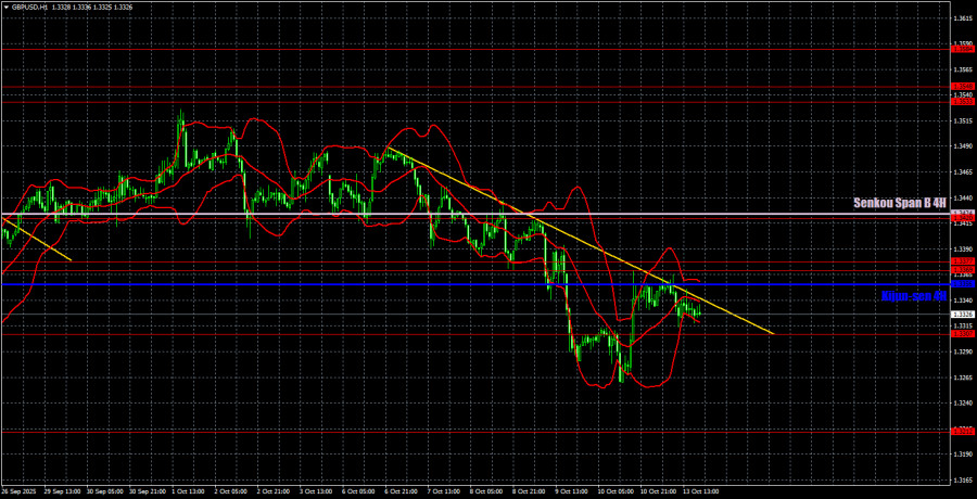 На часовом таймфрейме пара GBP/USD продолжает формирование нисходящей тенденции. И это еще одно доказательство алогичности общего движения. У доллара по-прежнему нет глобальных причин укрепляться, поэтому мы ожидаем возобновления восходящего тренда 2025 года практически в любом случае. В текущих обстоятельствах нужно ждать преодоления линии тренда и желательно линии Киджун-сен.
