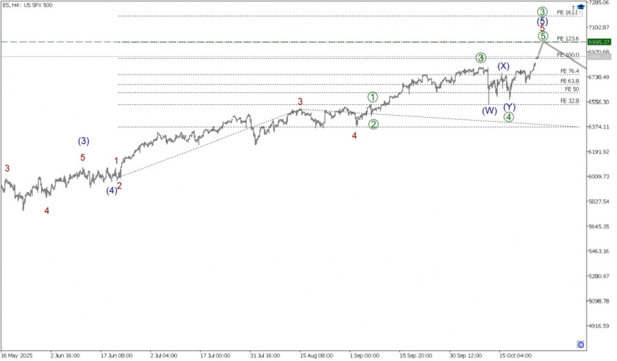 Волна 5 может принять форму импульса [1]-[2]-[3]-[4]-[5]. Завершены подволны [1]-[2]-[3]-[4]. Большая вероятность, что цена движется внутри заключительной подволны [5], она может завершится в районе уровня 6995.37. На указанной отметке величина подволны 5 составит 123.6% по расширению Фибоначчи от величины импульса [3].