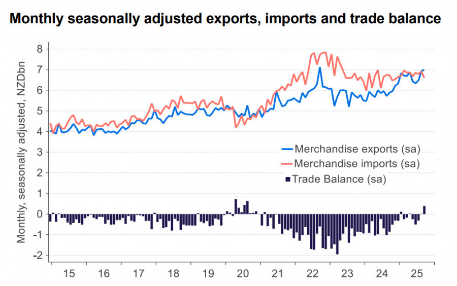 С точки зрения восстановления экономики Новой Зеландии после затяжного кризиса, который среди прочего привел к отрицательным показателям по ВВП на протяжении 5 кварталов подряд, отметим позитивную динамику во внешней торговле. Импорт стабилизировался, экспорт растет, особенно в последний год, что позволило выйти в сентябре на профицит в 400 млн, и это самый высокий показатель с 2020 г.