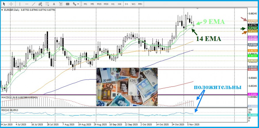 Несмотря на то что четвёртый день подряд пара EUR/GBP корректируется и остается на низком уровне, снижение может быть ограничено, поскольку евро получает поддержку от сохраняющихся осторожных настроений относительно дальнейших перспектив политики Европейского центрального банка. Ожидается, что в ближайшее время ЕЦБ сохранит текущие ставки без изменений, поскольку рынки оценивают вероятность их снижения к сентябрю 2026 года всего в 45%, что значительно ниже октябрьских 80%.