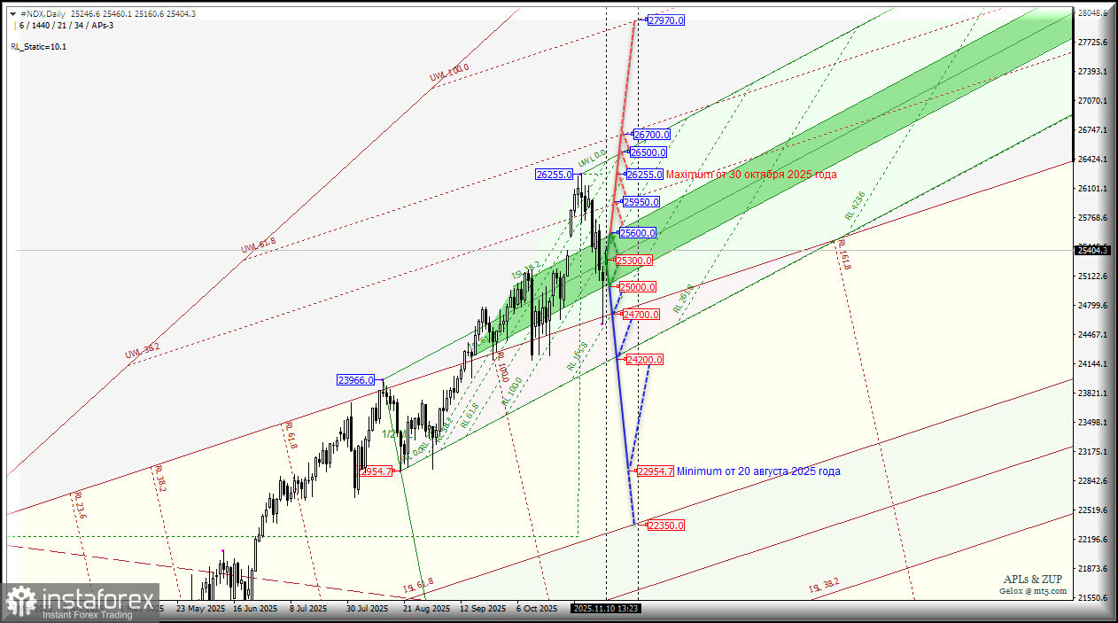 #NDX - NASDAQ-100 - ноябрь - перспективы.  Комплексный анализ - вилы Эндрюса APLs & ZUP - с 11 ноября 2025