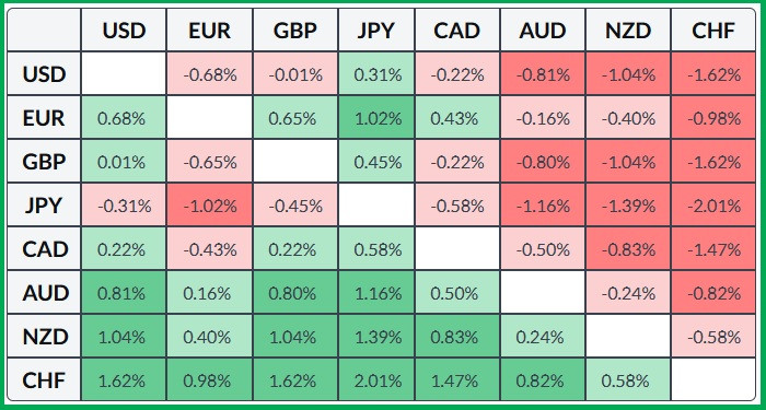 Ниже представлена таблица, показывающая изменение курса доллара США по отношению к основным валютам за текущую неделю. Наибольшая сила у доллара зафиксирована по отношению к японской иене.