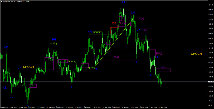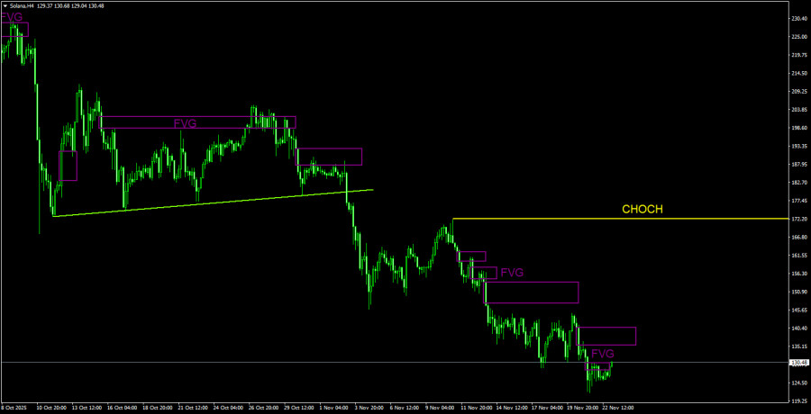 Последний виток падения на дневном ТФ начался из ближайшего «медвежьего» FVG. Таким образом, у трейдеров была возможность открывать короткие позиции. В принципе, мы предупреждали, что солана относительно легко может достичь уровень 120$. Этот уровень был почти отработан. Так как никаких признаков завершения нисходящей тенденции нет, мы считаем, что этот уровень – далеко не предел падения. А само падение может быть длительным, так как нисходящего тренда по «битку» мы не видели три года.