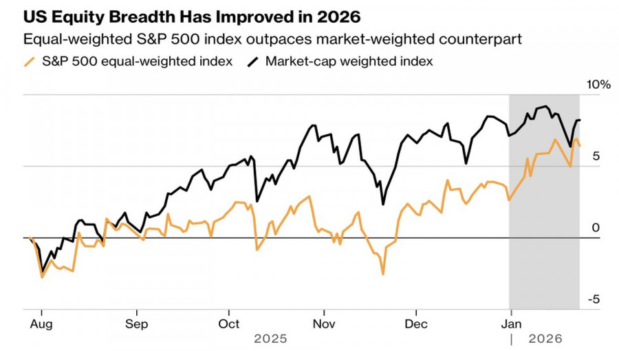 Новое – это хорошо забытое старое. На рубеже 2025 и 2026 на рынке акций США процветала ротация. Сила американской экономики давала основания для ухода из акций технологических компаний к бумагам компаний с малой капитализацией. Russell 2000 превосходил S&P 500 в самой продолжительной победной серии с 1990-х. Тем не менее приближение выхода в свет корпоративной отчетности Великолепной семерки заставило инвесторов пересмотреть свои взгляды. Если прибыли окажутся впечатляющими, не стоит ли вернуться к прежним лидерам?Динамика средневзвешенного и обычного S&P