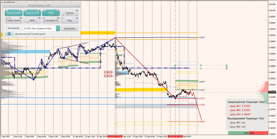 Среднесрочная тенденция: в шорт. Максимальное скопление объемов среднесрочной тенденции расположено в диапазоне по котировкам 0.58470-0.58630. В настоящий момент по паре совершаются инвестиционные операции ниже указанного диапазона, что говорит о силе продавцов.