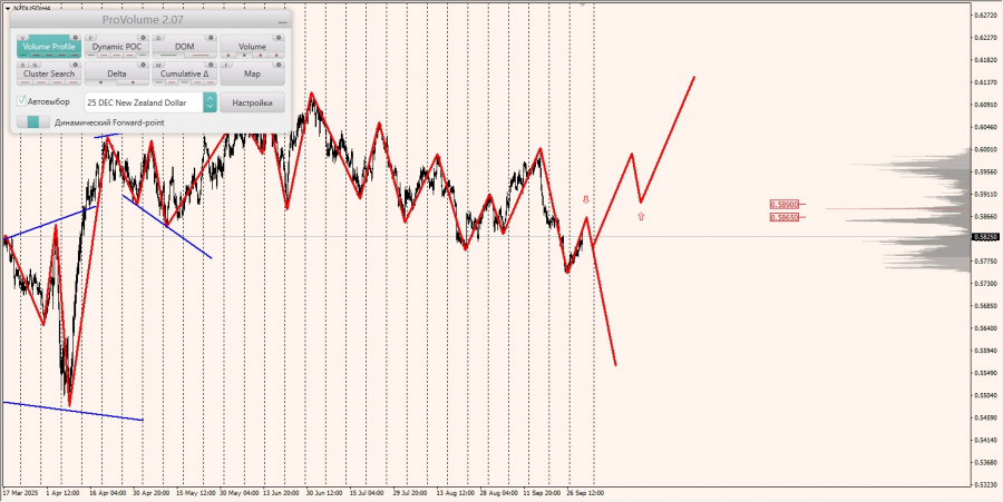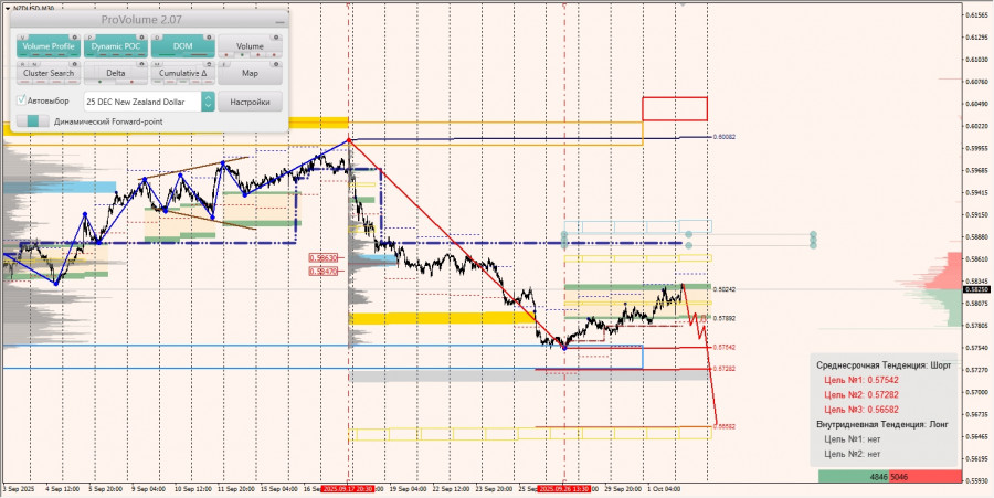Среднесрочная тенденция: в шорт. Максимальное скопление объемов среднесрочной тенденции расположено в диапазоне по котировкам 0.58470-0.58630. В настоящий момент по паре совершаются инвестиционные операции ниже указанного диапазона, что говорит о силе продавцов.