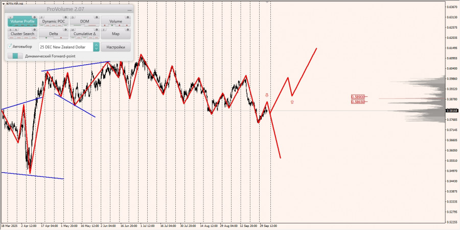 Область выгодных цен на продажу с точки зрения маржинального обеспечения не изменилась и располагается между зонами 1/4 и 1/2, построенными от минимума 26.09.2025.