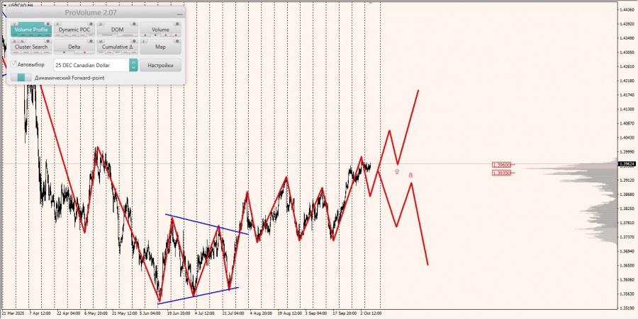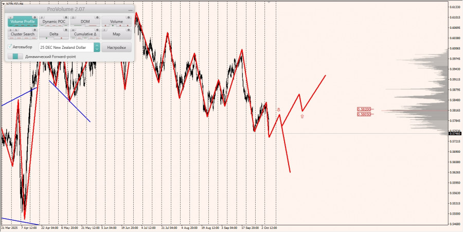 Область выгодных цен на продажу с точки зрения маржинального обеспечения не изменилась и располагается между зонами 1/4 и 1/2, построенными от минимума 26.09.2025.