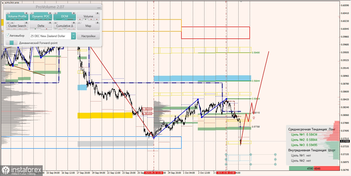 Среднесрочная тенденция: в лонг. Максимальное скопление объемов среднесрочной тенденции расположено в диапазоне по котировкам 0.58100-0.58200. В настоящий момент по паре совершаются инвестиционные операции ниже указанного диапазона, что говорит о слабости покупателей.