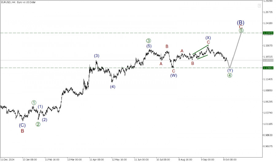 Рынок по Евродоллару в долгосрочной перспективе может формировать крупную бычью коррекция (B), которая принимает форму стандартного зигзага A-B-C. На сегодняшний день полностью завершены только первые две его части - импульс A и коррекция B. На последнем участке графика мы можем наблюдать развитие бычьей волны C, которая, по всей видимости, принимает форму импульса. На текущий момент завершены первые четыре его части - подволны [1]-[2]-[3]-[4]. В процессе построения ,бычья финальная подволна [5]. Большая вероятность, что быки внутри волны [5] смогут отправить рынок в область уровня 1.219. На указанной отметке величина крупной импульсной волны [5] составит 50% по расширению Фибоначчи от предыдущей импульсной волны [3]. Таким образом, при продолжении роста, стоит рассмотреть открытие длинных позиций с текущего уровня, с целью забрать прибыль на указанной отметке. После достижения уровня 1.208, ожидается смена тренда, а именно ожидается развитие финального медвежьего импульса (C). В текущей ситуации рекомендуется рассматривать открытие длинных позиций.