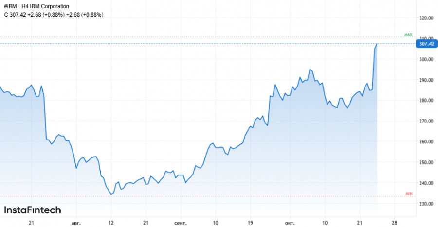 Рост акций IBM стал реакцией рынка на квартальные показатели: выручка составила $16,3 млрд, что на 9% выше показателей аналогичного периода прошлого года и выше консенсус-прогноза в $16,09 млрд. Скорректированная прибыль на акцию достигла $2,65, превысив ожидания $2,45.