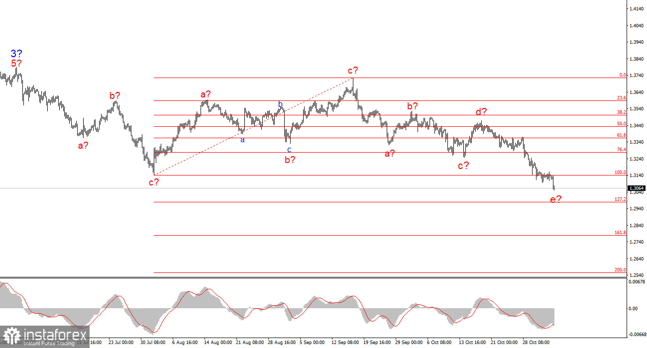 Волновая картина инструмента GBP/USD видоизменилась. Мы продолжаем иметь дело с повышательным, импульсным участком тренда, но его внутренняя волновая структура приобретает более сложный вид. Волна 4 принимает трехволновой вид, и ее структура получается в разы протяженнее, чем у волны 2. Очередная понижательная коррекционная структура близится к своему завершению. Я продолжаю ожидать, когда основная волновая структура возобновит свое построение с первоначальными целями около 38 и 40 фигур, и считаю, что это может произойти уже в начале ноября.