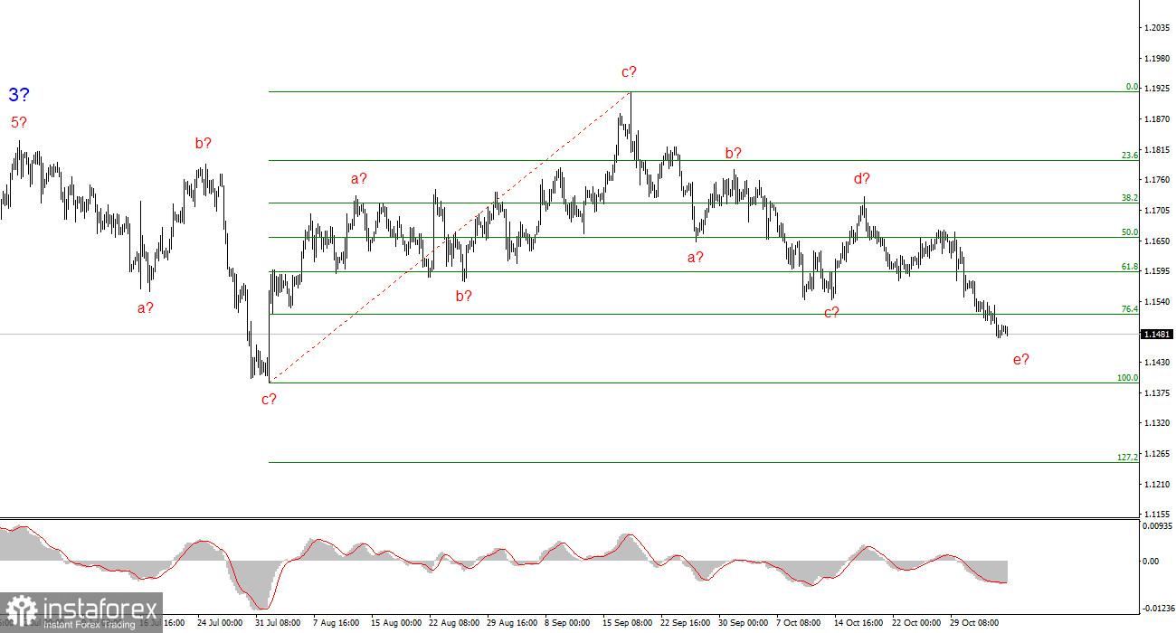 Волновая картина инструмента GBP/USD видоизменилась. Мы продолжаем иметь дело с повышательным, импульсным участком тренда, но его внутренняя волновая структура приобретает более сложный вид. Волна 4 принимает трехволновой вид, и ее структура получается в разы протяженнее, чем у волны 2. Очередная понижательная коррекционная структура близится к своему завершению. Я продолжаю ожидать, когда основная волновая структура возобновит свое построение с первоначальными целями около 38 и 40 фигур, и считаю, что это может произойти уже в начале ноября.
