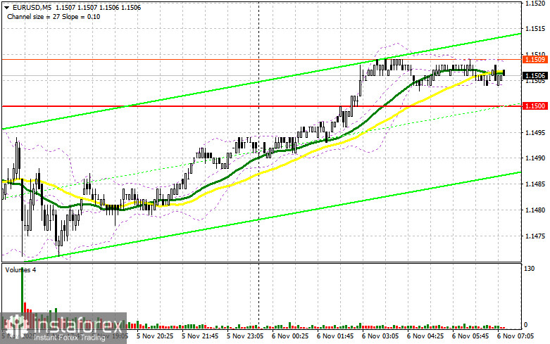 Вчера я так и не дождался подходящих точек входа в рынок. Давайте посмотрим на 5-минутный график и разберемся с тем, что там произошло. В своем утреннем прогнозе я обращал внимание на уровень 1.1499 и планировал от него принимать решения по входу в рынок. Рост в район 1.1499 произошел, но до теста не хватило буквально пары пунктов, так что я остался без сделок. Во второй половине дня история повторилась с уровнем 1.1500, без обновления которого я так и не решился продавать евро.