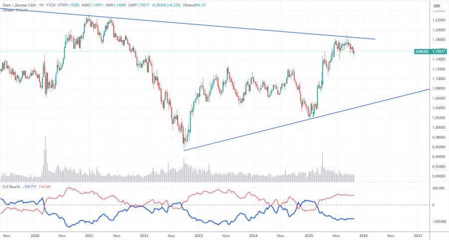 Последний отчет COT датирован 23 сентября. С тех пор больше отчетов COT не публиковалось из-за «шатдауна» в США. На иллюстрации выше отлично видно, что нетто-позиция некоммерческих трейдеров долгое время была «бычьей», медведи с трудом перешли в зону собственного превосходства в конце 2024 года, но очень быстро ее потеряли. С тех пор, как Трамп вступил в должность президента США во второй раз, падает только доллар. Мы не можем сказать, что падение американской валюты продолжится с вероятностью 100%, но текущее развитие событий в мире намекает именно на этот вариант.