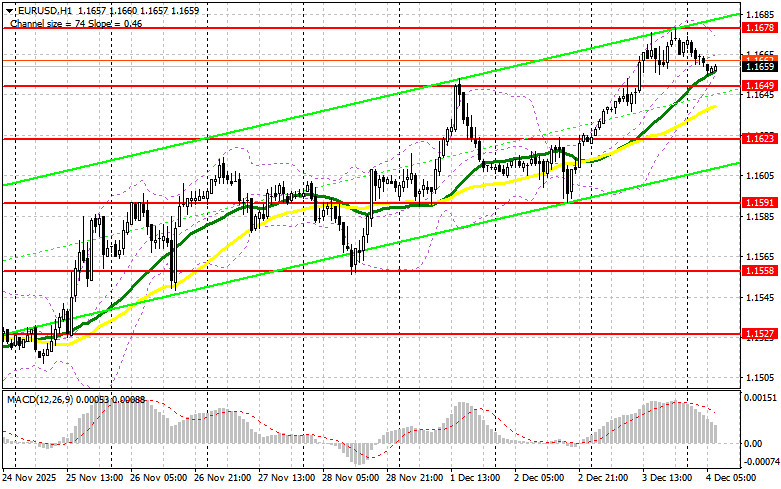 Доллар снизился против евро после новостей о том, что число занятых от ADP в США в ноябре этого года сократилось сразу на 32 000, тогда как экономисты ожидали рост этого показателя. Все это только укрепило рыночные ожидания относительно дальнейшего снижения процентных ставок в США в декабре этого года. Сегодня в первой половине дня ожидаются цифры по изменению объема розничной торговли еврозоны за октябрь этого года. Прогнозируется, что показатель останется без изменений по сравнению с сентябрем. В случае слабых показателей и коррекции пары EUR/USD первого проявления покупателей евро ожидаю в районе поддержки 1.1649, еще вчера выступавшей в роли сопротивления. Формирование там ложного пробоя даст точку входа в длинные позиции с целью восстановления пары к сопротивлению 1.1678, выступающему максимумом этого месяца. Прорыв и обратный тест этого диапазона станут подтверждением правильных действий на покупку евро уже в расчете на более крупный рывок пары к 1.1703. Самой дальней целью выступит максимум 1.1726, где буду фиксировать прибыль. Тест этого уровня укрепит бычий рынок по евро. При варианте снижения EUR/USD, и отсутствия активности в районе 1.1649, давление на пару вернется. Продавцы наверняка сумеют дотянуться до следующего интересного уровня 1.1623. Лишь формирование там ложного пробоя будет подходящим условием на покупку евро. Открывать длинные позиции сразу на отскок будут от 1.1591 с целью восходящей коррекции в 30-35 пунктов внутри дня.