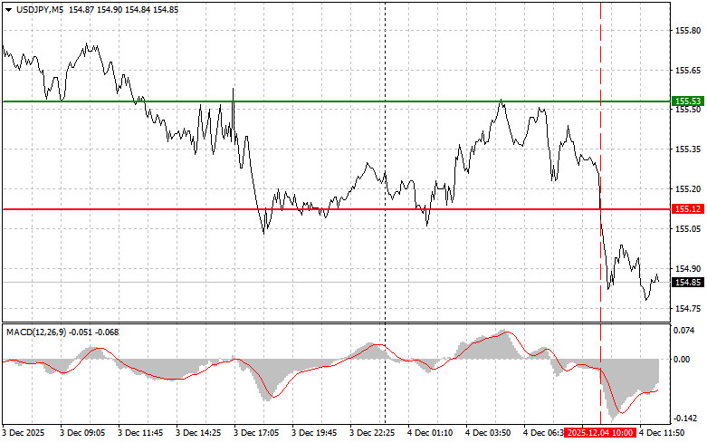 Разбор сделок и советы по торговле японской иенойТест цены 155.12 пришелся на момент, когда индикатор MACD много прошел вниз от нулевой отметки, что ограничивало нисходящий потенциал пары. По этой причине я не продавал доллар. Сегодняшнее выступление главы Банка Японии Кадзуо Уэда сыграло на стороне покупателей иены. Уэда отметил, что в настоящий момент регулятор имеет возможность оценить нейтральную процентную ставку лишь приблизительно, что указывает на сложности с будущими принятиями решений, однако не отменяет рыночных ожиданий по повышению стоимости заимствований уже на