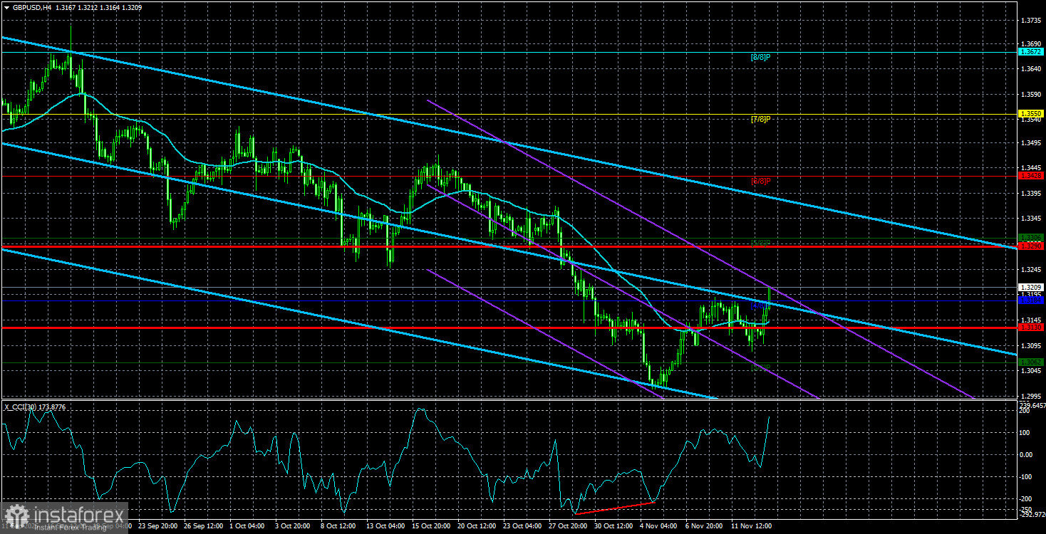 Средняя волатильность пары GBP/USD за последние 5 торговых дней составляет 80 пунктов. Для пары фунт/доллар это значение является «средним». В пятницу, 14 ноября, таким образом, мы ожидаем движения внутри диапазона, ограниченного уровнями 1,3130 и 1,3290. Старший канал линейной регрессии направлен вниз, но из-за технической коррекции на старших ТФ. Индикатор CCI четырежды заходил в область перепроданности, что предупреждает о возобновлении восходящего тренда. Сформировалась новая, очередная «бычья» дивергенция, от которой и начался последний виток роста.