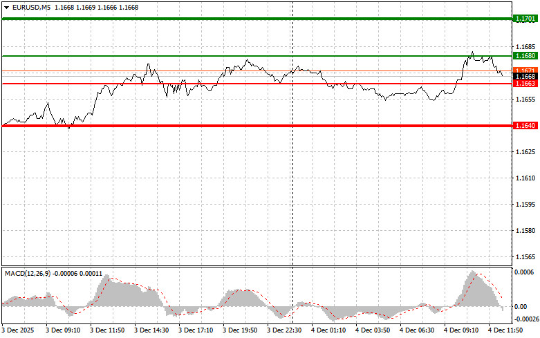 Сценарий №2: продавать евро сегодня также собираюсь в случае двух подряд тестов цены 1.1680 в момент, когда индикатор MACD будет находиться в области перекупленности. Это ограничит восходящий потенциал пары и приведет к обратному развороту рынка вниз. Можно ожидать снижения к противоположному уровню 1.1663 и 1.1640.
