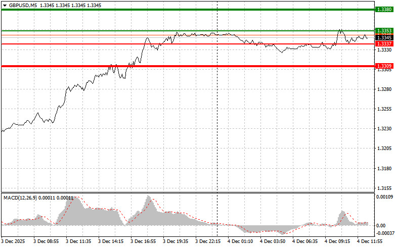 Сценарий №2: покупать фунт сегодня также планирую в случае двух подряд тестов цены 1.3337 в момент, когда индикатор MACD будет находиться в области перепроданности. Это ограничит нисходящий потенциал пары и приведет к обратному развороту рынка вверх. Можно ожидать рост к противоположным уровням 1.3353 и 1.3380.