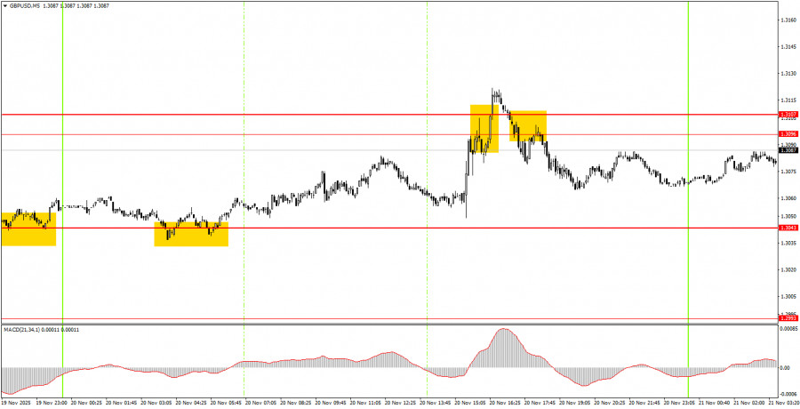 5 daqiqalik taymfreymda e'tiborga olinadigan darajalar: 1.2913, 1.2980–1.2993, 1.3043, 1.3096–1.3107, 1.3203–1.3211, 1.3259, 1.3329–1.3331, 1.3413–1.3421, 1.3466–1.3475, 1.3529–1.3543, va 1.3574–1.3590. Juma kuni Buyuk Britaniya va AQShda noyabr oyi uchun xizmatlar va ishlab chiqarish sohalarining biznes faollik indekslari e'lon qilinadi. Muhimroq ma'lumotlar yo'qligi sababli, bu hisobotlar bozor reaksiyasini biroz kuchaytirishi mumkin. Ammo bu reaksiya kuchli bo'lmasligi kutilmoqda, chunki umumiy volatillik pastligicha qolmoqda. Shuningdek, Buyuk Britaniyada chakana savdo hisobotlari, AQShda esa Michigan universitetining iste'molchi ishonchi indeksi e'lon qilinadi.