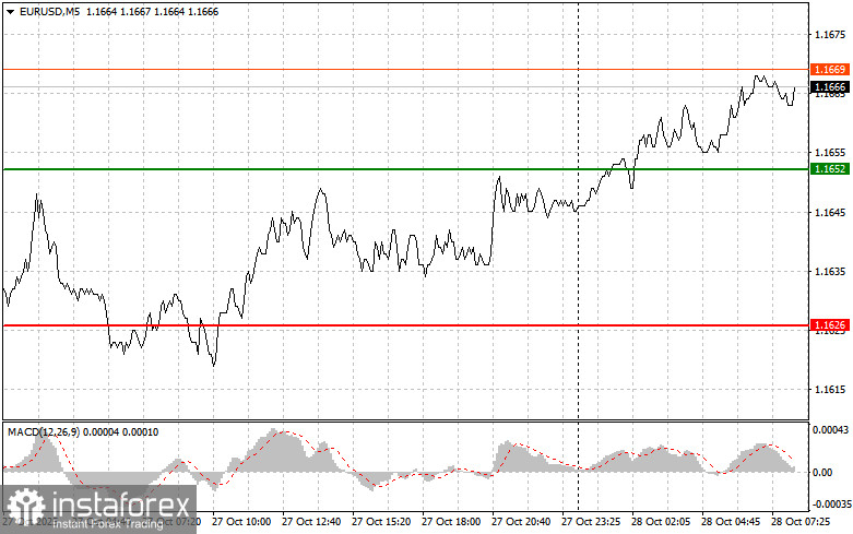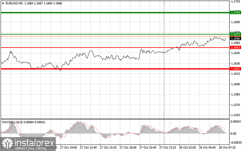 Kịch Bản số 1: Tôi dự định bán euro khi giá đạt 1.1653 (đường màu đỏ trên biểu đồ). Mục tiêu sẽ là 1.1622, tại đó tôi sẽ thoát khỏi thị trường và ngay lập tức mua theo hướng ngược lại (kỳ vọng một sự di chuyển 20-25 pip từ mức đó). Áp lực đối với cặp tiền sẽ trở lại hôm nay với các báo cáo yếu kém. Quan trọng! Trước khi bán, đảm bảo rằng chỉ báo MACD đang dưới mức không và đang bắt đầu giảm từ đó.
