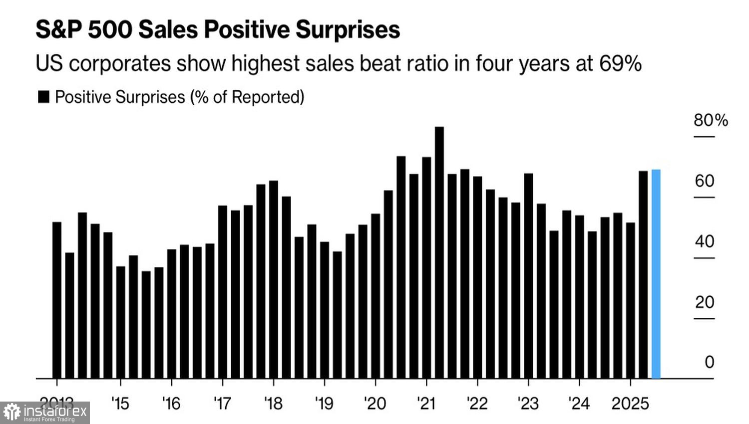 Khoảng 86% các công ty báo cáo lợi nhuận vượt dự báo, trong khi 69% vượt kỳ vọng doanh thu. Con số sau là cao nhất kể từ năm 2021. Độ lệch giữa dữ liệu thực tế và ước tính là 2,4%, cao hơn đáng kể so với trung bình lịch sử là 0,5%. Kết quả tài chính của các tập đoàn Mỹ cho thấy khả năng chịu đựng với thuế quan, khi họ giảm thiểu tác động tiêu cực từ thuế nhập khẩu thông qua việc tăng giá và/hoặc cắt giảm chi phí.
